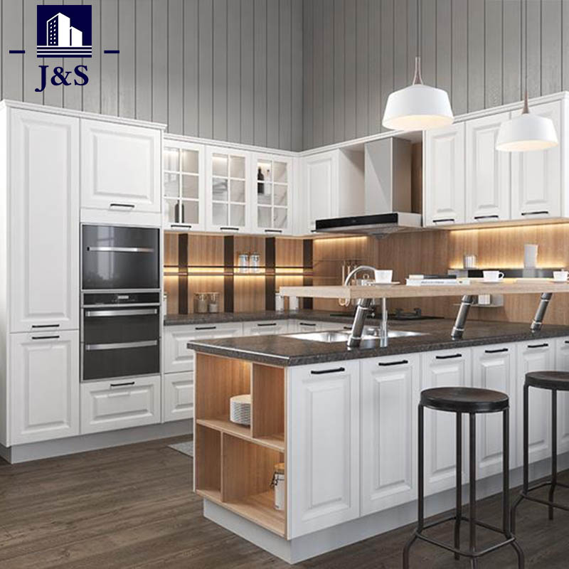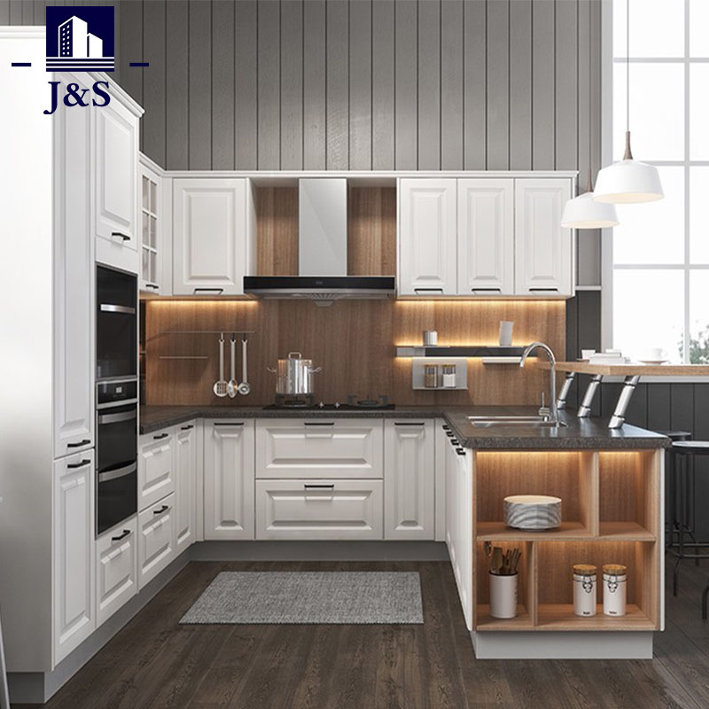 J&S ສະໜອງຕູ້ເຮືອນຄົວ PVC ສີຂາວແບບກຳນົດເອງ, ນີ້ແມ່ນຕູ້ເຮືອນຄົວຮູບຊົງຕົວ U, ກະດານປະຕູ PVC ຫຸ້ມຫໍ່ສີຂາວທີ່ມີໂປຣໄຟລ໌, ບານພັບປິດອ່ອນຂອງ Blum ຄຸນນະພາບດີ. ກ່ອງໃຫຍ່ຊ່ວຍໃຫ້ທ່ານສາມາດເກັບເຄື່ອງອາຫານໄດ້ຫຼາຍຂຶ້ນ.